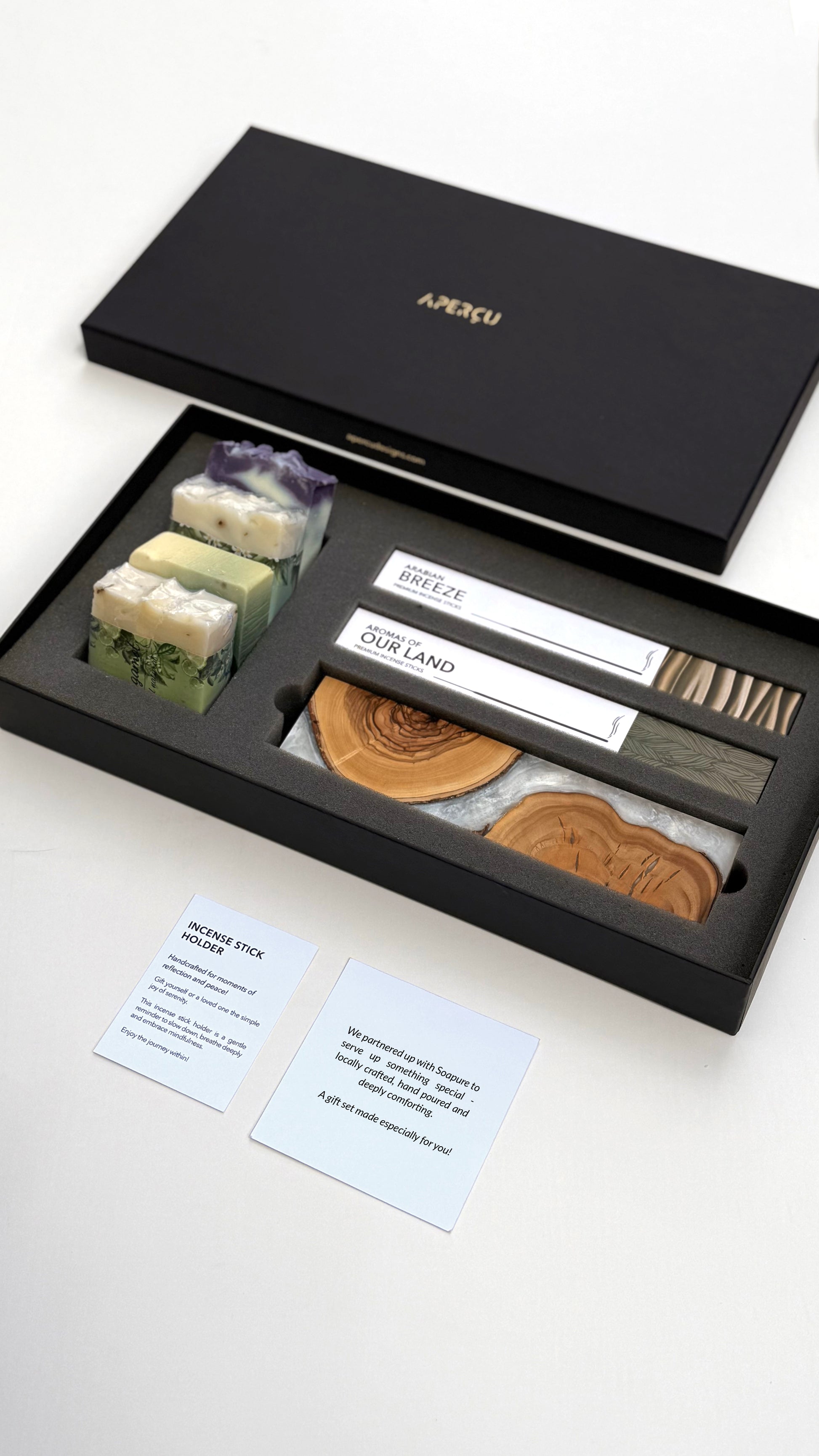 Experience a moment of calm with our curated gift set, featuring hand-poured artisanal soaps crafted by Soapure, paired with our signature incense stick holder and premium incense sticks.